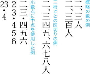 (1)漢数字で“にさんにん”などと概略の数を示す読点は、読点の後ろをベタ組(読点の占めるサイズは二分)とするのが原則である(二分アキとする、つまり読点の占めるサイズは全角とする方法もある)。二分アキとしない例を図2に示す。
