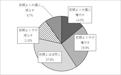 図1は今期(2025年4月から2026年3月)の設備投資予定である。「前期より大幅に増やす」は前回調査の12.4%から14.0%と、1.6pt増となった。「前期よりやや増やす」も20.0%から26.9%に増加した。両者を合わせると、回答企業の40.9%が前期よりも投資を増やすとしている(前回は32.4%)。前回の調査では3年連続の増加傾向からマイナスに転じたものの、今回は再び増加した。