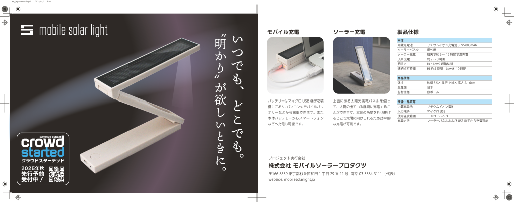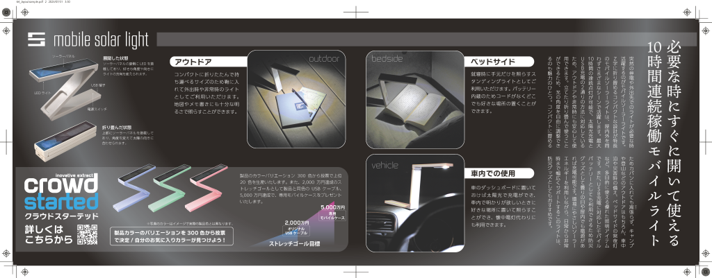 印刷物の制作者には、どのようなビジネス環境の下で印刷物が使用されているのかを把握し、それを制作コンセプトにつなげていく姿勢が求められる。今期の実技試験では、こうした動向を制作与件に取り入れ、「クラウドファンディングによって好みのカラーのモバイルソーラーライトを作る」という商品案内のパンフレット制作を出題した。「製品記者発表会および期間限定ショールームに置く特別感のあるパンフレット」を与件とし、データ制作の条件として、特殊加工に対応した別版(ニス版)データの制作も盛り込んだ。