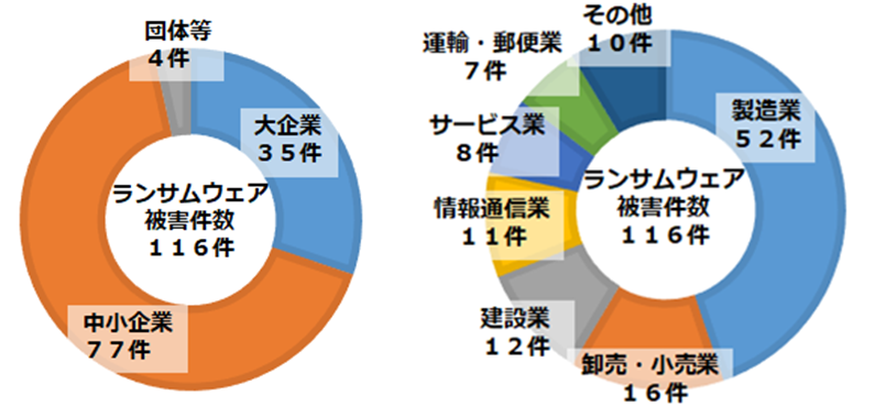 警察庁によると、2025年上半期におけるランサムウェアの被害報告件数は116件に上り、被害企業は大企業35件、中小企業77件、業種では製造業が52件と最も多い。