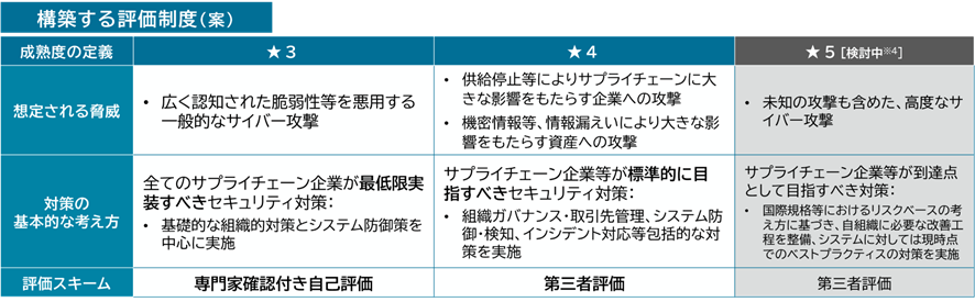 経済産業省「サプライチェーン強化に向けたセキュリティ対策評価制度」は、セキュリティ対策を可視化する仕組みで、サプライチェーン全体でのセキュリティ対策水準の向上を目的とする。具体的には、2社間の取引契約等において、発注元企業が、委託先企業側に適切な段階(★)を提示し、示された対策を促すとともに実施状況を確認することを想定している。