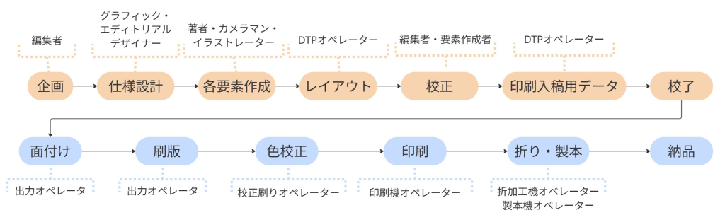以下は、印刷物制作の全工程の一例を、各工程を担う人材とともに示したものです。