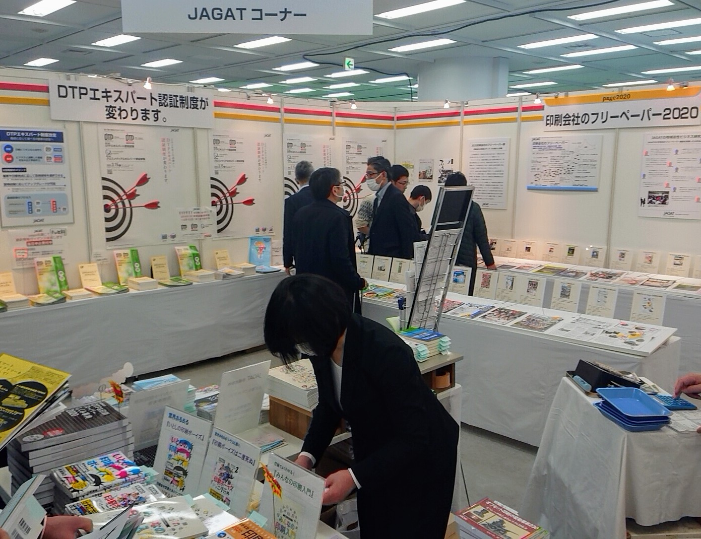 展示会はフロア別に、2Fはクリエイティブゾーンとグラフィックアーツ、グラフィックコミュニケーション、デジタルワークフロー、3Fは印刷全般、4Fは印刷サービス、印刷パートナーゾーン、JAGATコーナーで構成され、連絡通路で基調講演、カンファレンス、セミナー会場につながっている。初日の来場者数は前年比108%超えの約1.9万人を数えた模様だ。JAGATコーナーは書籍販売、フリーペーパー展示、DTPエキスパート・クロスメディアエキスパート受験者向けコーナーを展開している。印刷業務に携わる全ての人に役立つ『DTP&印刷スーパーしくみ事典2020』や『印刷料金2020年版』、GetNavi webでの連載マンガ「今日も下版はできません! 」を単行本化した『いとしの印刷ボーイズ』、印刷入門者におすすめの1冊『みんなの印刷入門』など発売している。ぜひ手にとって見てほしい。