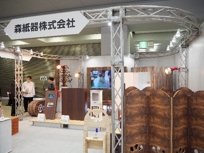 段ボール加工の可能性を追求し続けている。本展では Re-boadに印刷・加工を施した什器でブースを構成し、AED収納BOX、演台、デジタルサイネージのスタンド「PiO」ほか、多彩な施工例を紹介した。