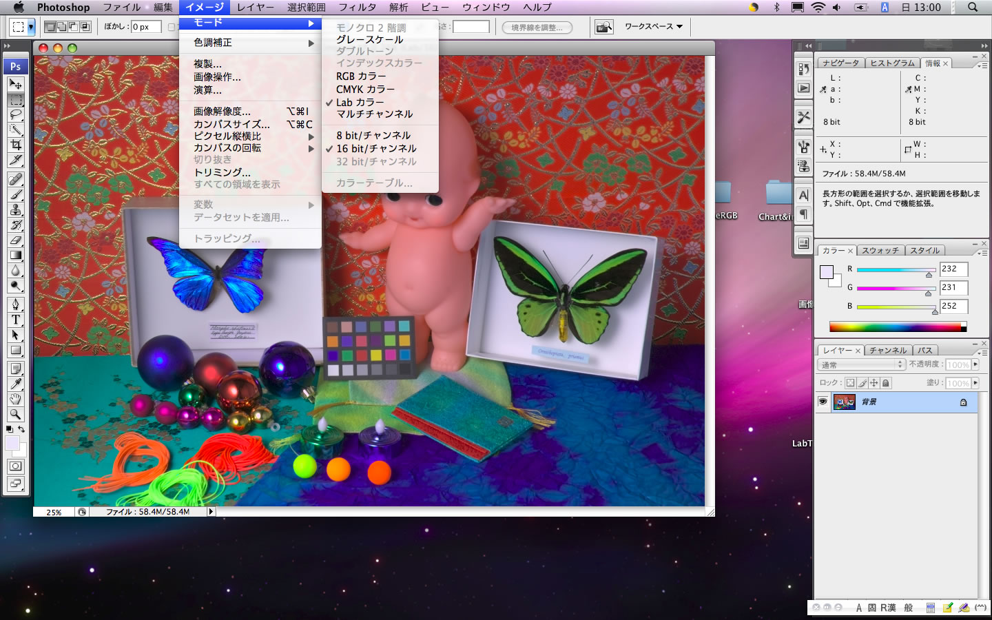 今回実験に使用したのはLab Tiff(図3)、Adobe RGB(図4)、200色くらいにモザイク化してチャートにしている画像(図5)だが、Labを基本としているので16bitであるのはいうまでもない。6分光カメラを使用したのは色の調子をより正確に入稿したかったということだ。従って色域の大きさだけに注目されると非常に心外なのである。色域を比較してみると6分光から変換したLabが図6でモルフォ蝶の羽がAdobe RGB領域からはみ出しているのが分かると思うが印刷によって再現するもの、しないものが出てくるはずだ(デジタル的なオペミスで再現しない場合もあるだろう?)。