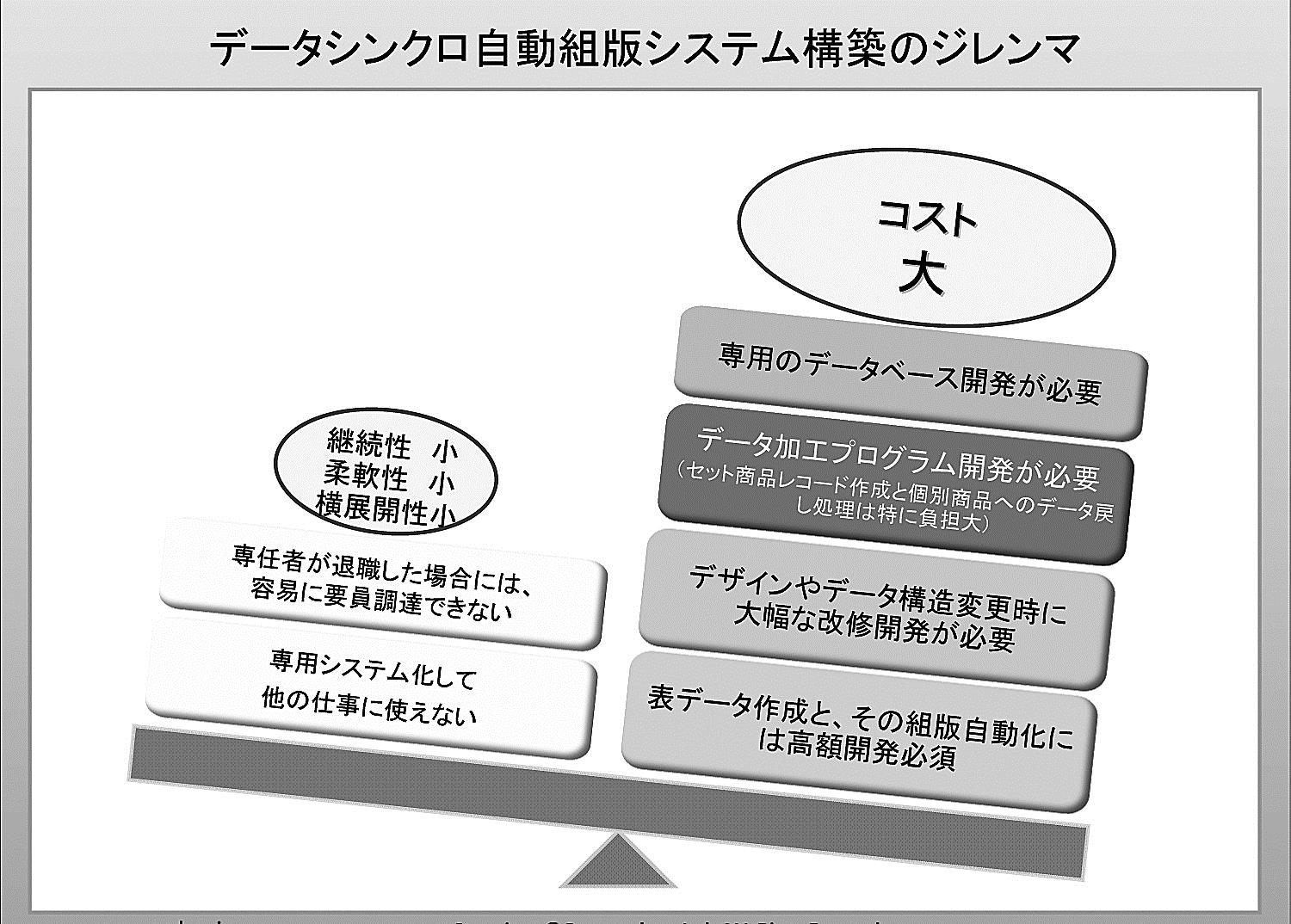 自動組版はコストがかかるのが常識だとの反応がある。1つは専用のデータベース開発が必要で、これは商品データベースの意味では仕方がないかもしれない。
