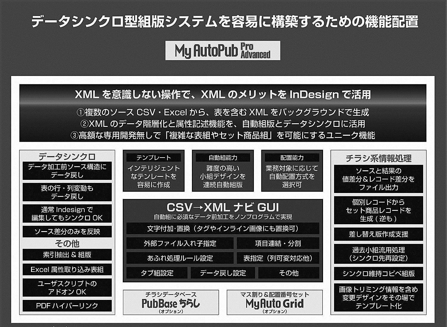難しい組版、表入り組版をInDesignで高速自動処理が可能なMyAutoPub Proとデザイン微調整ができるチラシ制作向け MyAutoPub Advancedを紹介する。
