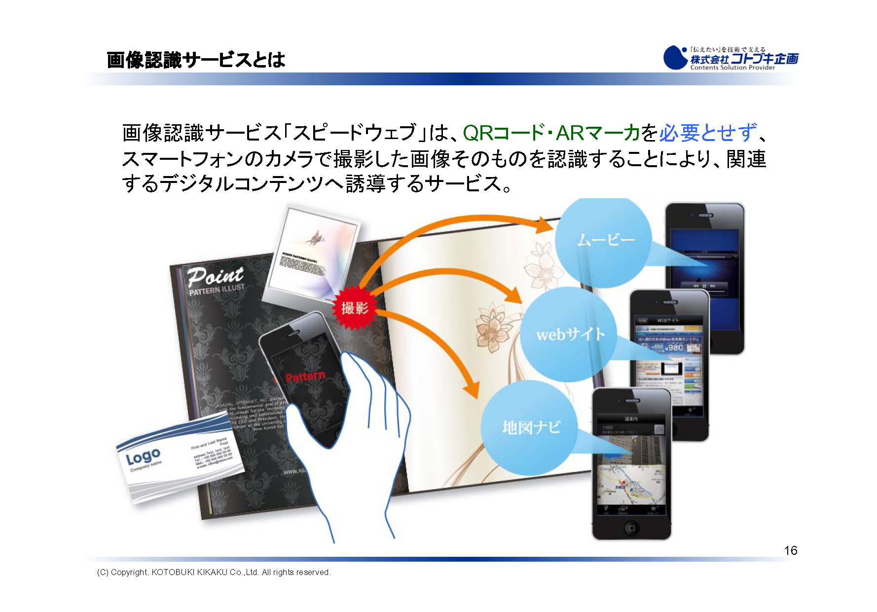 ただし、従来の印刷物では、残念ながらそのニーズにこたえることは難しいと思う。そのために、こういった印刷物とWebを連動させる何かが必要になってくる。そこで我々が注目して商品開発を行ったのが、画像認識サービスである。