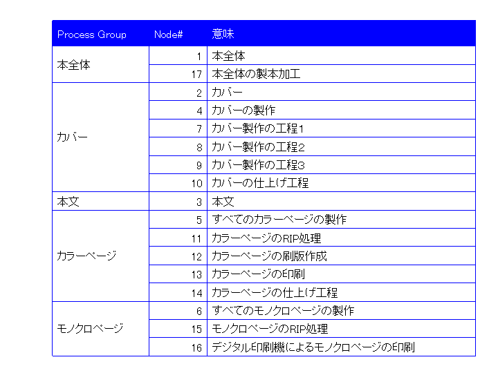 なお、(17)は製本作業を表しており、(1)本全体と直接紐付けられている。製本は表紙と本文といった部品全体を束ねる作業となるので、個々の部品に対してではなく本全体と結び付けられることとなる。カバーや帯、さらには二つ折り貼り込みといったさまざまな付物がある複雑な印刷物であっても、'Product nodes'で部品展開を定義し、その下に工程や作業を定義していくことで表現できるし、工程や作業は個別の部品に対して定義してもよいし、印刷物全体あるいはいくつかの部品をまとめて定義してもよいので非常に柔軟に対応できる。