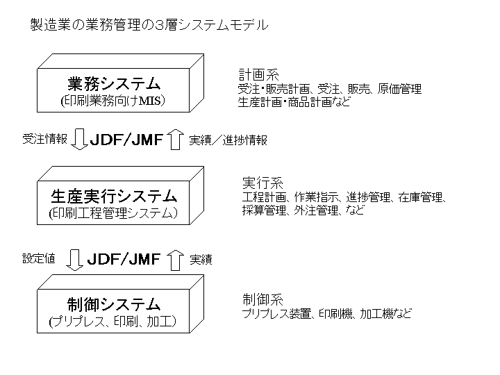 これは、受注管理、販売管理、原価管理といった主としてお金に関わる管理を行う「業務システム」と工程計画、作業指示、進捗・実績管理などの生産系の管理を行う「生産実行システム」、そしてプリプレス機器や印刷機、加工機などをコントロールする「制御システム」の3層に機能分化して、それぞれが密にコミュニケーションをとりあうことでトータルな業務管理を実現しようというものである。現状のJDF対応MISは「業務システム」と「生産実行システム」の機能をあわせ持ち、プリプレスメーカや印刷機メーカの個々の「制御システム」と個別に情報(JDF/JMF)をやりとりしているので非常に開発負荷が高くなることになる。
