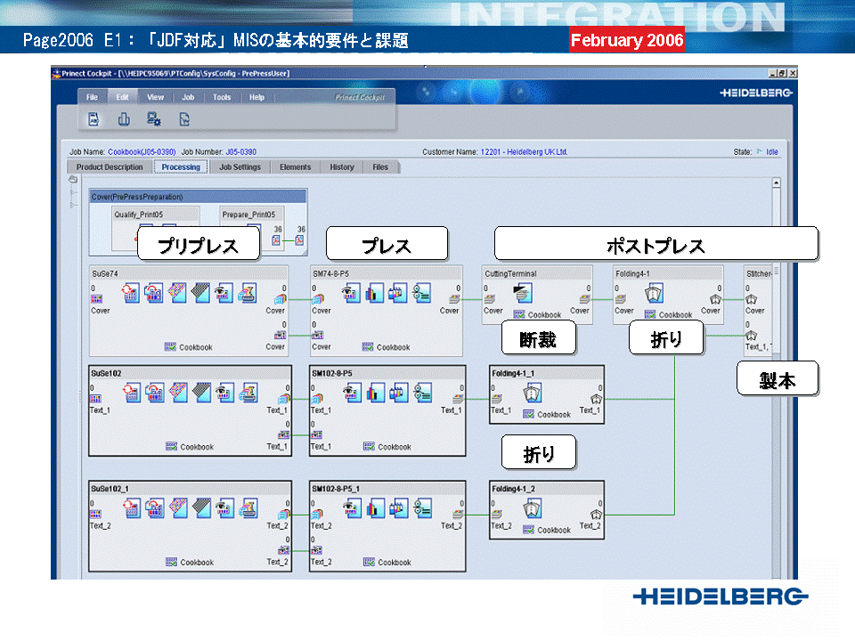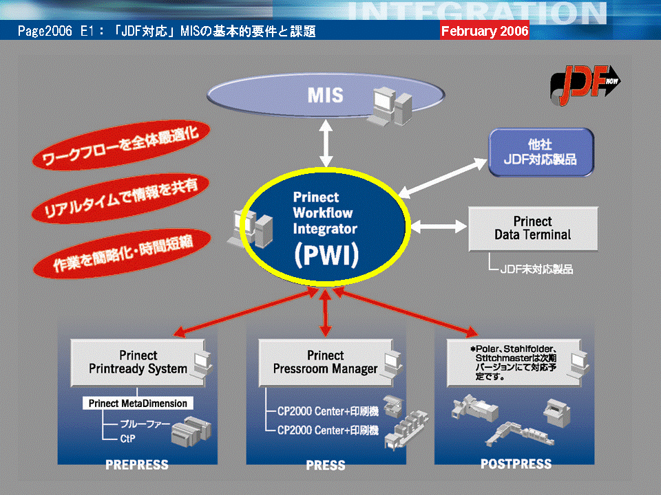 これまで印刷業界ではJDF対応の「生産実行システム」は存在しなかったが、PAGE2006において世界に先駆けてハイデルベルグ社から「Prinect Workflow Integrator」という製品が発表された(参考出品)。