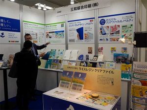 オリジナルクリアファイル印刷サービス「かさまーと」の多彩なラインナップを紹介。SDGs関連では、紙製で糊を使用せず圧着機で留めた「エコペーパーファイル」、再生プラスチック100%の「高透明エコ」、ストーンペーパー利用の「ストーンファイル」をアピールした。