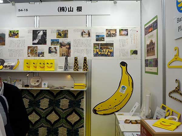 ファトレード認定されたバナナペーパーをアピールした。越前和紙、洋紙、板紙のシリーズがある。板紙で製作したエシカルハンガーを紹介。そのほか採用事例として卓上カレンダーや包装紙を展示した。
